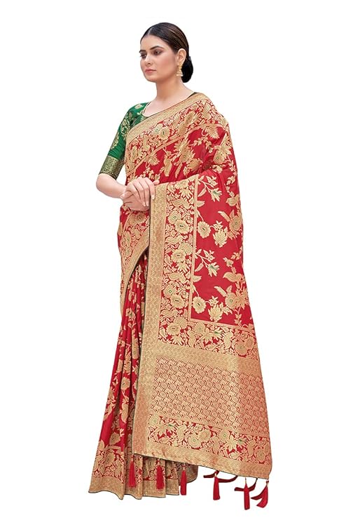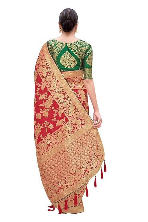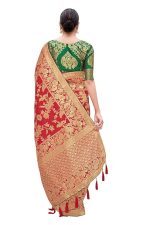 - Product Highlights : Fabric: Banarasi Silk (Saree & Blouse) || Work: Zari Woven (Saree), Zari Woven Brocade (Blouse) || Colour: Saree – Red | Blouse –Green || This Banarasi silk saree is intricately woven with zari detailing.